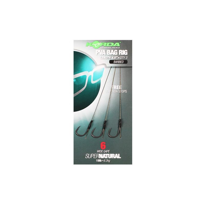 Si vous n'avez pas le temps ou l'envie d'attacher vos propres montages pour la pêche au sac PVA solide, alors ceux-ci sont le choix parfait. Ils sont conçus pour être utilisés avec nos sacs Solidz PVA et ont la longueur parfaite pour ce style de pêche, avec seulement 4,5 pouces de long. Ils sont attachés à l'aide d'un hameçon Wide Gape avec un petit morceau de tube thermorétractable pour l'aider à tourner et à s'accrocher dans la bouche du poisson, et celui-ci est attaché à une souche de rupture appropriée de tresse Supernatural ultra-souple pour correspondre à la taille de l'hameçon. À l'autre extrémité, il y a une boucle qui peut être attachée à un émerillon QC, ou de style boucle à boucle à un émerillon ou un émerillon à anneau sur le système de laisse de votre choix. Différentes tailles d'appâts peuvent être utilisées sur le même montage grâce aux Extenda Stops (fournis). Il existe un choix d'appâts avec ou sans ardillon, en tailles 4, 6 ou 8, tous étant attachés sur du Supernatural 18lb. Vous obtenez trois plates-formes dans chaque pack.