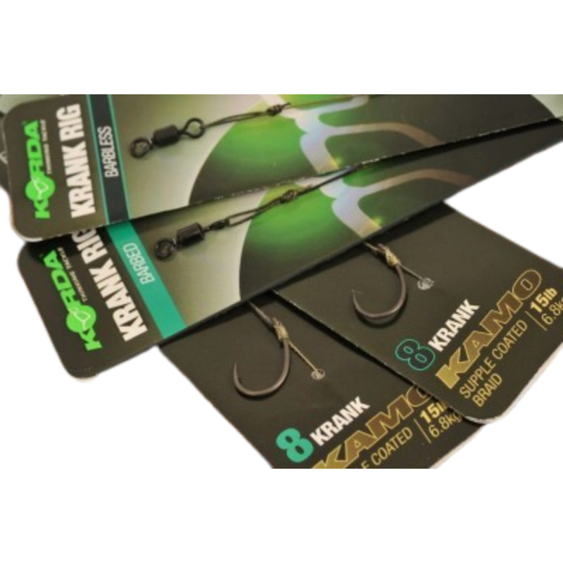 Le montage Krank Ready Rig est un montage prêt à l'emploi simple mais très efficace. Il vous suffit de le sortir de son emballage, de l'attacher au système de plombs de votre choix, d'y placer un appât et de le lancer, l'esprit tranquille : vous utilisez un montage aux excellentes propriétés de ferrage, répondant à des normes rigoureuses. Ce montage est équipé de notre hameçon Krank et d'une tresse enduite de Kamo, dont la résistance à la rupture est adaptée à la taille de l'hameçon utilisé : 13,6 kg pour la taille 2 ; 9,1 kg pour la taille 4 ; et 6,8 et 6,8 et 10. Il s'agit d'un montage simple sans nœud, avec une partie de Kamo dénudée au niveau de l'hameçon pour optimiser sa capacité à se retourner et à s'accrocher à la bouche, et une boucle à l'émerillon assure un montage parfaitement au fond du lac et une action de lancer puissante. Chaque montage est fourni avec des stop-appâts Extenda, permettant ainsi d'utiliser le montage avec des appâts de toutes tailles sur une longueur de cheveu identique. Les montages sont disponibles en versions avec et sans ardillon, un par paquet.