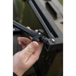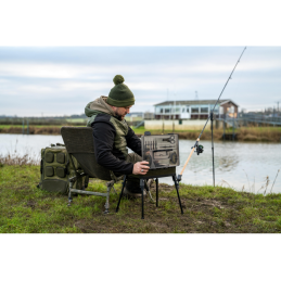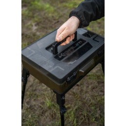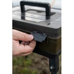 Le compartiment principal est modulable avec des séparateurs ajustables, tandis que le couvercle intègre deux BLOX peu profonds pour protéger vos bas de ligne pré-montés des intempéries. Équipée de pieds télescopiques (33-55 cm), elle se place facilement devant vous, que vous soyez assis ou à l’abri, pour un accès rapide à tout votre matériel.