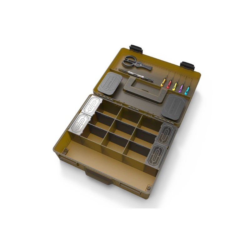 Robuste et pratique, cette boîte est équipée d’une poignée intégrée, d’une poignée latérale, de clips de sécurité et d’un joint étanche, garantissant transport facile et protection maximale du contenu. Un gabarit de longueur pour montage des bas de ligne est également inclus pour plus de praticité.