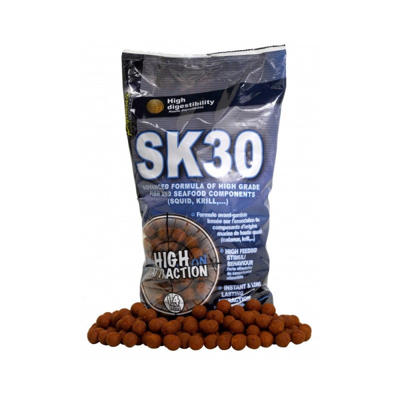 Formulée à partir de matières premières carnées de haute qualité reconnues pour leurs principes attractifs tels que: farines de poissons séchées à base température, extraits solubles de protéines de poissons, extraits marins, et associés à des composés attractifs solubles provenant du calamar ainsi que du krill, la « SK 30 » possède un profil en acides aminés ainsi qu'en acides gras permettant de la classer comme étant un appât indispensable dans la sélection de gros poissons sur un poste.Renforcée en huiles naturelles reconnues comme stimulantes des sens olfacto-gustatifs ainsi qu'en composants favorisant la prise alimentaire, cet appât à haute digestibilité favorisera l'accoutumance, voire la dépendance, des poissons lors d'amorçages à long terme sans aucun phénomène de saturation!