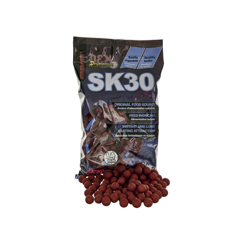 Formulée à partir de matières premières carnées de haute qualité reconnues pour leurs principes attractifs tels que: farines de poissons séchées à base température, extraits solubles de protéines de poissons, extraits marins, et associés à des composés attractifs solubles provenant du calamar ainsi que du krill, la « SK 30 » possède un profil en acides aminés ainsi qu'en acides gras permettant de la classer comme étant un appât indispensable dans la sélection de gros poissons sur un poste.Renforcée en huiles naturelles reconnues comme stimulantes des sens olfacto-gustatifs ainsi qu'en composants favorisant la prise alimentaire, cet appât à haute digestibilité favorisera l'accoutumance, voire la dépendance, des poissons lors d'amorçages à long terme sans aucun phénomène de saturation!