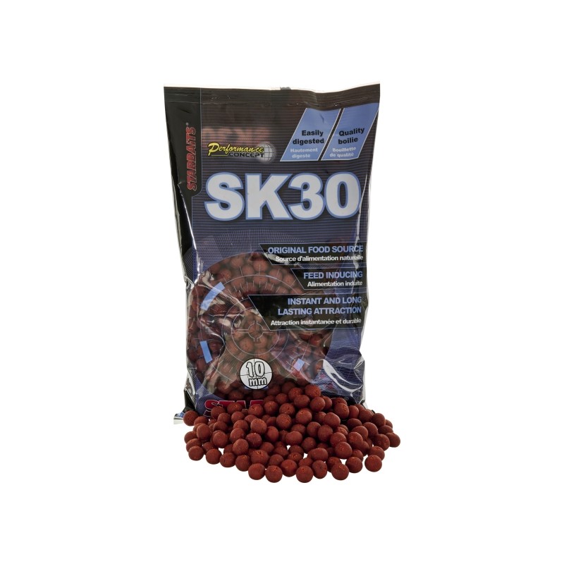Formulée à partir de matières premières carnées de haute qualité reconnues pour leurs principes attractifs tels que: farines de poissons séchées à base température, extraits solubles de protéines de poissons, extraits marins, et associés à des composés attractifs solubles provenant du calamar ainsi que du krill, la « SK 30 » possède un profil en acides aminés ainsi qu'en acides gras permettant de la classer comme étant un appât indispensable dans la sélection de gros poissons sur un poste.Renforcée en huiles naturelles reconnues comme stimulantes des sens olfacto-gustatifs ainsi qu'en composants favorisant la prise alimentaire, cet appât à haute digestibilité favorisera l'accoutumance, voire la dépendance, des poissons lors d'amorçages à long terme sans aucun phénomène de saturation!