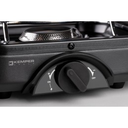 Automate haute pression avec 2 brûleurs en acier inoxydable pour cartouches butane/propane kemper 1121F et 1126F46. Allumage intact et prêt au transport. Connexion directe aux cartes – Exigence réglementaire