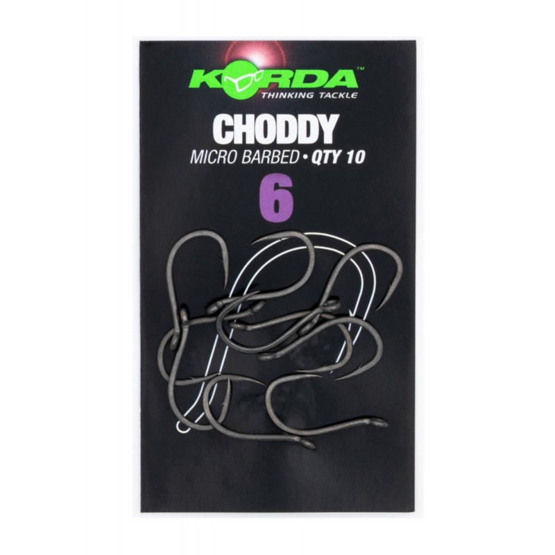Cet hameçon a été spécialement conçu pour être utilisé avec des bas de ligne rigides et des montages tels que le montage chod ou le montage rigide à charnière, mais il peut également être utilisé avec d'autres montages pop-up. Son œillet tourné vers l'extérieur assure une courbure continue du bas de ligne à l'hameçon lors de l'utilisation de montages rigides. Le reste de sa forme reprend le motif emblématique du Wide Gape, mais avec un fil légèrement plus épais. La pointe légèrement incurvée est très piquante, et l'ardillon est d'une taille qui ne gêne pas la pénétration, mais qui, une fois en place, assure une bonne tenue de l'hameçon. Le Choddy est disponible avec ou sans ardillon, en tailles 12, 10, 8, 6 ou 4, avec dix hameçons par paquet.