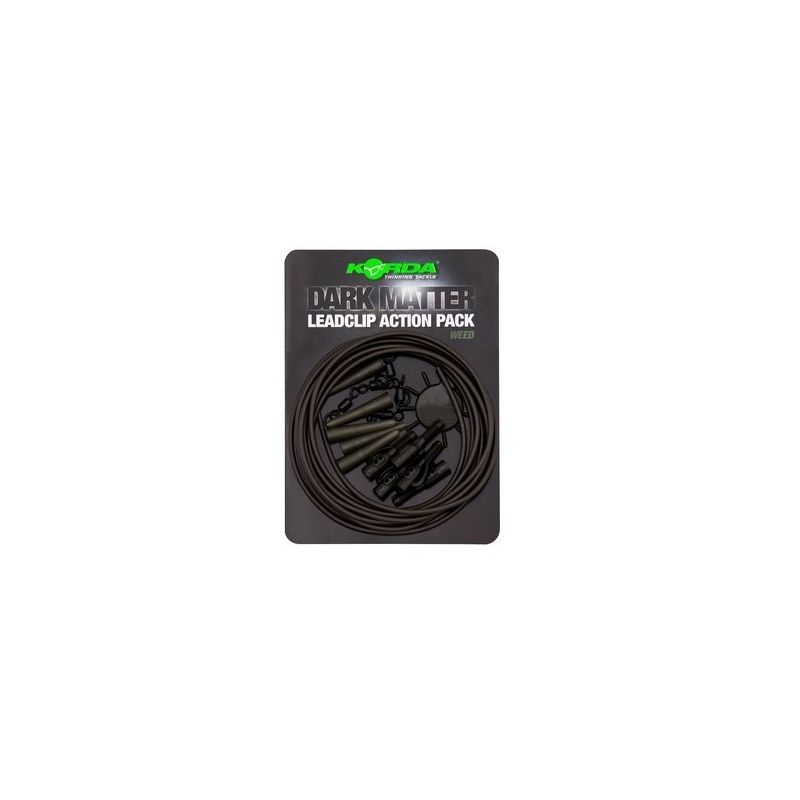 Les packs action Korda sont conçus pour vous offrir tous les éléments nécessaires à une installation spécifique, le tout dans un seul pack. Le pack action Dark Matter Lead Clip vous permet de créer cinq montages complets avec clip plomb, tube compris, avec la possibilité de les pêcher en position fixe ou semi-fixe en insérant la goupille de retenue dans le clip plomb pour y fixer l'émerillon.