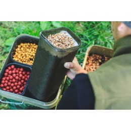 Le système Kontainer a une taille de 17 litres et est livré avec quatre Kontainers séparés qui peuvent chacun être remplis avec quelque chose de différent et où vous ne voulez pas mélanger tous vos appâts ensemble, ou vous voulez seulement le faire au point où vous voulez. pour l'introduire réellement dans le lac.