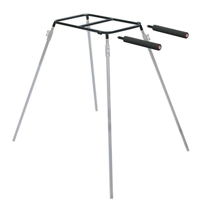 Pour monter la station, il suffit de visser les piques ou les mâts tempête sur les quatre coins des pas de vis du cadre de la station et de régler cette dernière à la hauteur souhaitée. Placez vos sceaux de 17 litres dans les deux cavités et votre station est prête à être utilisée. Ajoutez le support de canne en vissant les deux bras sur les côtés du cadre et vous êtes prêts à amorcer. Pour fixer la canne sur le support, placez le talon de votre canne sur le plus petit bras et en haut du plus haut. Votre canne se placera naturellement dans sa loge, grippée par le rembourrage EVA elle ne bougera plus.