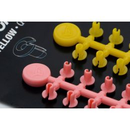 De nombreux montages modernes nécessitent de fixer l'appât sur un anneau ou un micro-émerillon avec du fil à appât, ce qui peut s'avérer délicat, surtout dans l'obscurité ou avec les doigts froids. Les bouchons à appât simplifient la fixation de l'appât : il suffit d'enfiler un sur l'extrémité du fil à appât. Une fois l'appât fixé à l'hameçon avec une aiguille à appât, enfoncez-le dans l'appât jusqu'à ce qu'il soit bien en place, puis, à l'aide d'un briquet, allumez les extrémités du fil pour maintenir le bouchon en place. Trois combinaisons de couleurs de bouchons à appât sont disponibles, pour s'harmoniser avec votre appât ou ajouter une touche de couleur : transparent ; rouge/blanc ; ou rose/jaune. Fixés sur un support central, ils se détachent facilement par simple rotation. Chaque paquet contient 20 bouchons à appât, dix de chaque couleur.