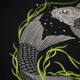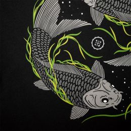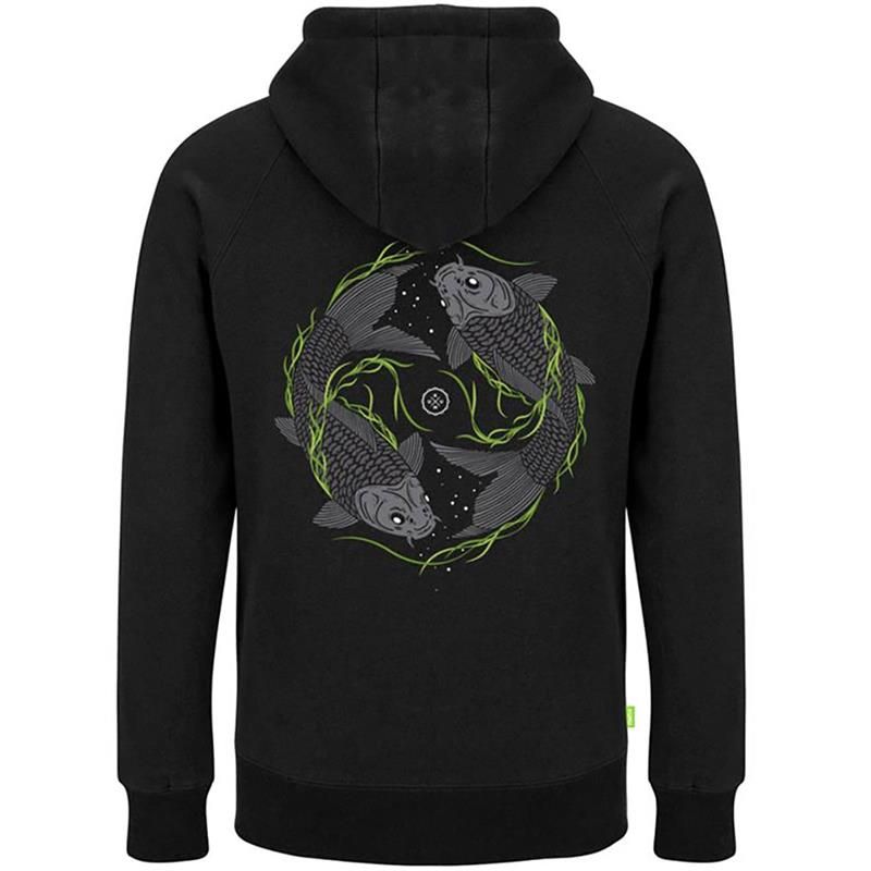 .Dessiné à la main à partir de zéro, notre graphique Vortex représente 2 carpes tournant à l'unisson à travers des lits d'algues. Sérigraphie 5 couleurs composée de gris atténués avec du vert contrasté sur notre tissu brossé ultra doux et luxueux de 320 g avec des extrémités de cordon trempées de couleur assortie.
