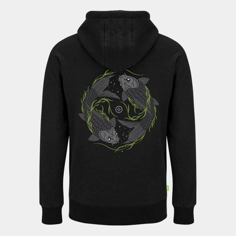 Dessiné à la main à partir de zéro, notre graphique Vortex représente 2 carpes tournant à l'unisson à travers des lits d'herbes. Sérigraphie 5 couleurs composée de gris atténués avec du vert contrasté sur notre tissu brossé ultra doux et luxueux de 320 g avec des extrémités de cordon trempées de couleur assortie.